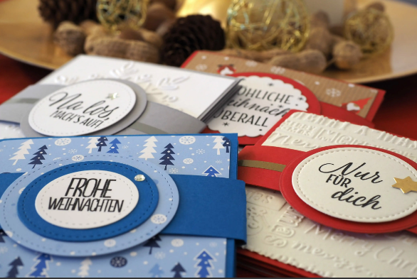 Wir haben Weihnachtskarten für unser Projekt „Weihnachtspost gegen Einsamkeit“ mit Stempeln,TetraPak Druck etc. gestaltet.
