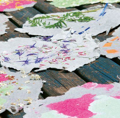 Altpapier wird geschreddert und eingeweicht. Mit Metallsieben kann man nun das Papier abschöpfen, färben und mit Blüten aller Art verzieren. Heraus kommen wundervolle individuelle Papiere.